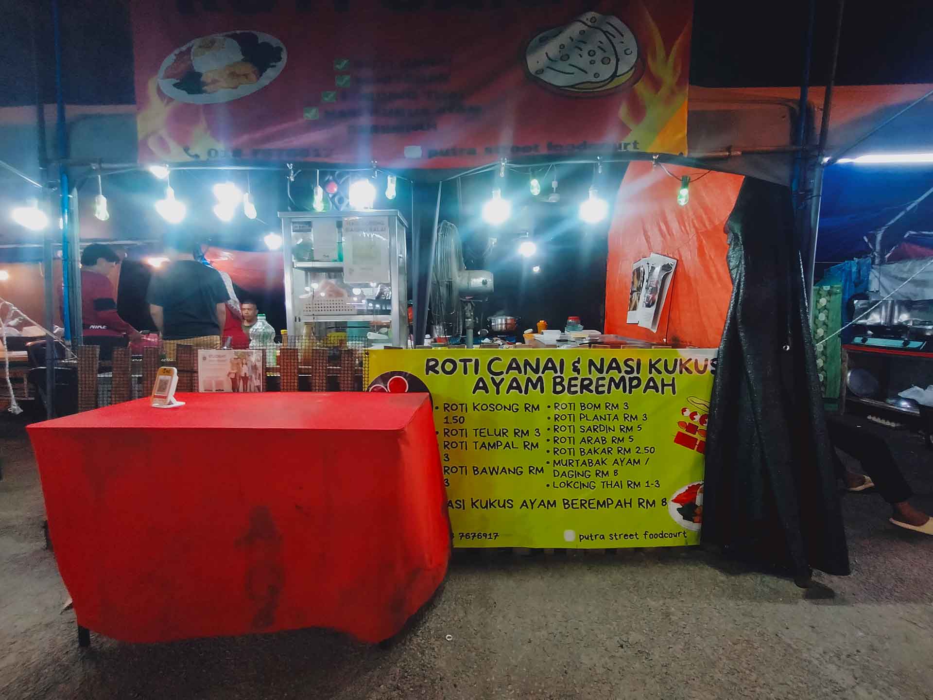 Nikmati sarapan atau makan malam yang santai di Kedai Roti Canai Putra Street Food Court yang menawarkan pelbagai pilihan roti canai garing dan nasi kukus yang menyelerakan. Gerai ini menyediakan hidangan popular seperti Roti Kosong, Roti Telur, Roti Bom, Murtabak Ayam/Daging, serta Nasi Kukus Ayam Berempah dan Lokcing Thai yang pastinya memuaskan selera anda dengan harga yang sangat berpatutan.